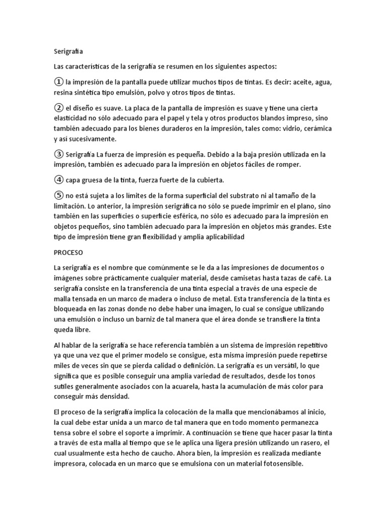 Las características de la serigrafía se resumen en los siguientes aspectos: