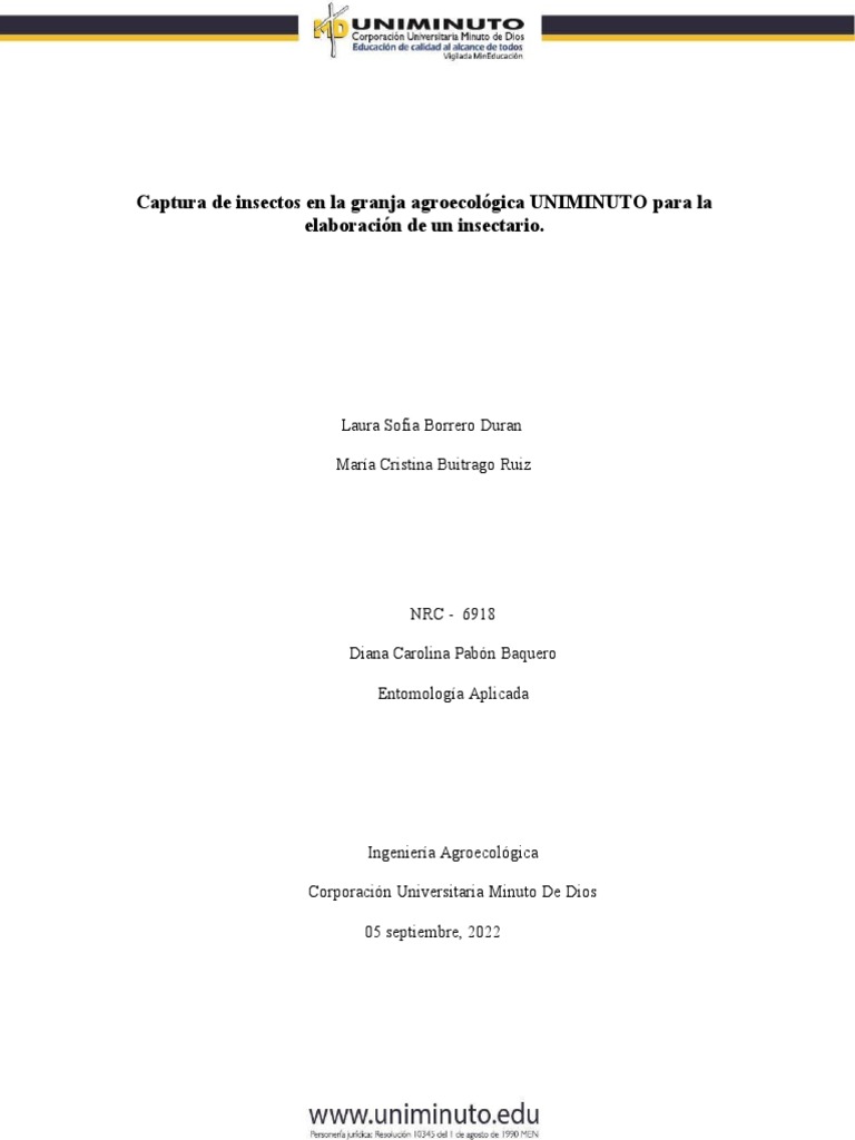 Captura de insectos en la granja agroecológica UNIMINUTO para la