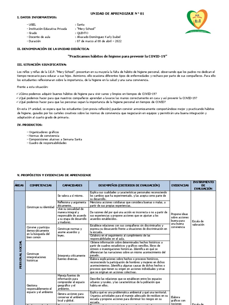 En esta 1º unidad, se espera que los estudiantes (con previa reflexión) puedan convivir armoniosamente comportándose mejor y practicando hábitos