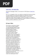 Fue la crucifixin en la montaa los nervios del tiempo en vinagre, la tumba como horca tan untada de sangre como las flgidas espinas de mis lgrimas es el mundo mi herida, la Mara de Dios en su dolor como tres rboles doblada y con pechos de pjaro debajo de la tnica es la mujer de interminable herida, con alfileres en lugar de lgrimas. Era el cielo, Juan Cristo, y cada esquina trovadora gan la marcha de los clavos llevados hacia el cielo hasta que el arco-iris tricolor de mis pechos se arrastr entre los polos alrededor del mundo en su despertar de caracol Yo junto al rbol donde colgaban los ladrones, mediquillo de toda gloria castr al esqueleto en este minuto montaoso y junto al reloj de viento que del sol es testigo padezco a los infantes celestiales en los latidos de mi corazn.