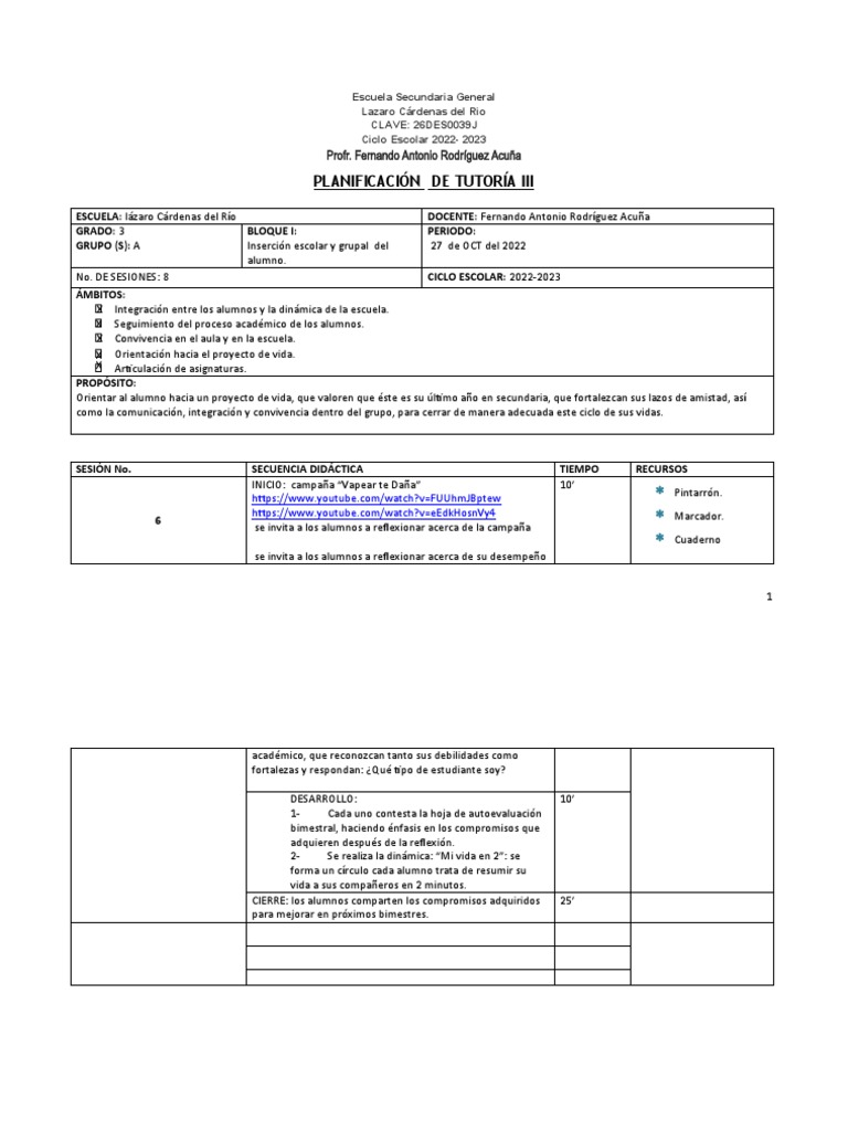 No. DE SESIONES: 8 CICLO ESCOLAR: 2022-2023