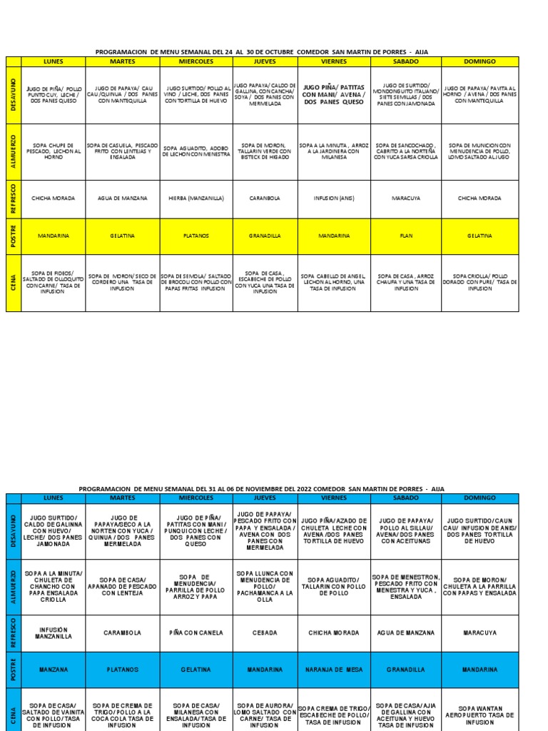 PROGRAMACION DE MENU SEMANAL DEL 24 AL 30 DE OCTUBRE COMEDOR SAN MARTIN DE PORRES - AIJA