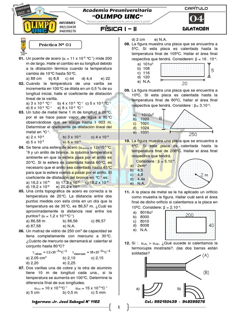 04. Se tiene una esfera de acero (acero = 12x10-8°C- 6ºC. Si esta placa es calentada hasta la