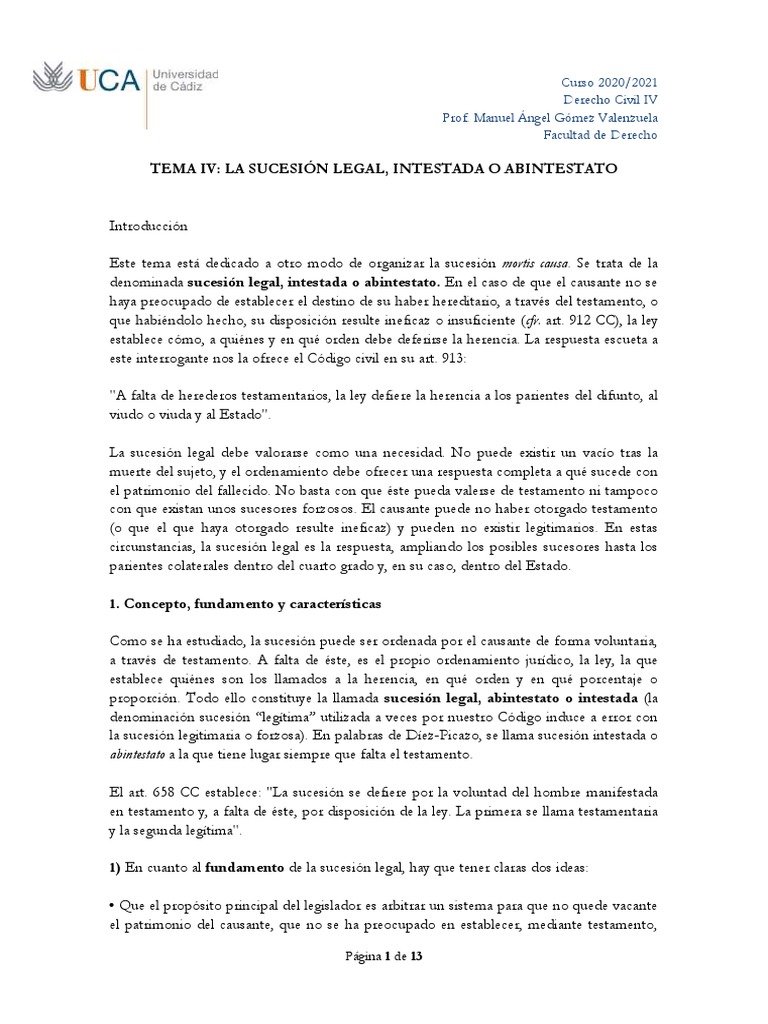 TEMA IV: LA SUCESIÓN LEGAL, INTESTADA O ABINTESTATO