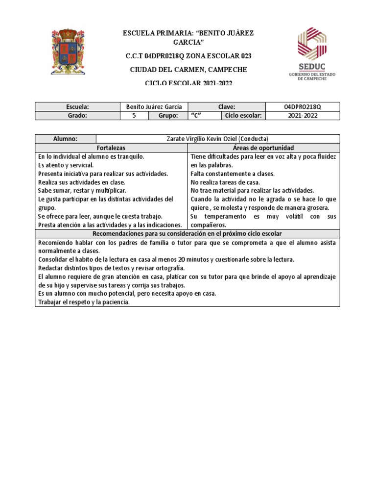 Alumno: Zarate Virgilio Kevin Oziel (Conducta)