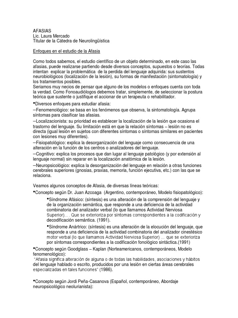 “Afasia significa alteración de alguna o de todas las habilidades, asociaciones y hábitos