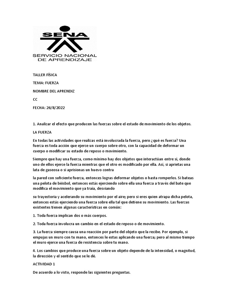 1. ¿Qué entiendes por fuerza? Menciona cinco ejemplos y por cada uno de ellos realiza un
