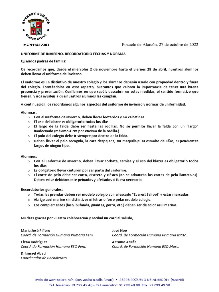 UNIFORME DE INVIERNO. RECORDATORIO FECHAS Y NORMAS