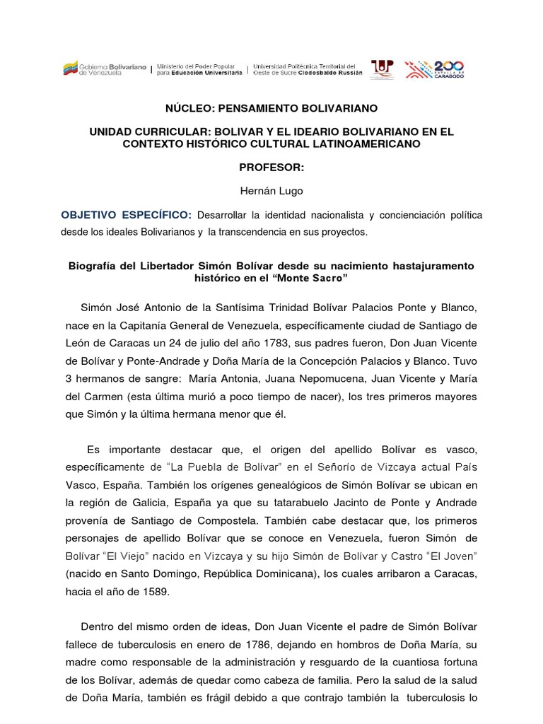 Biografía del Libertador Simón Bolívar desde su nacimiento hastajuramento