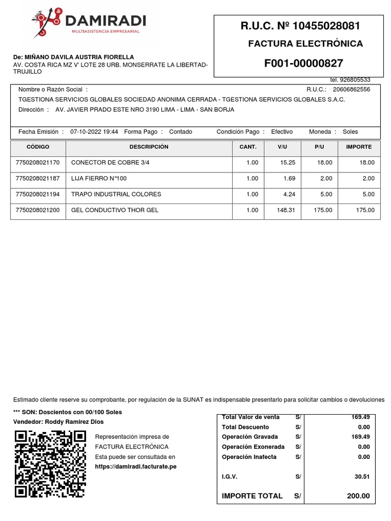 Representación impresa de Operación Gravada S/ 169.49