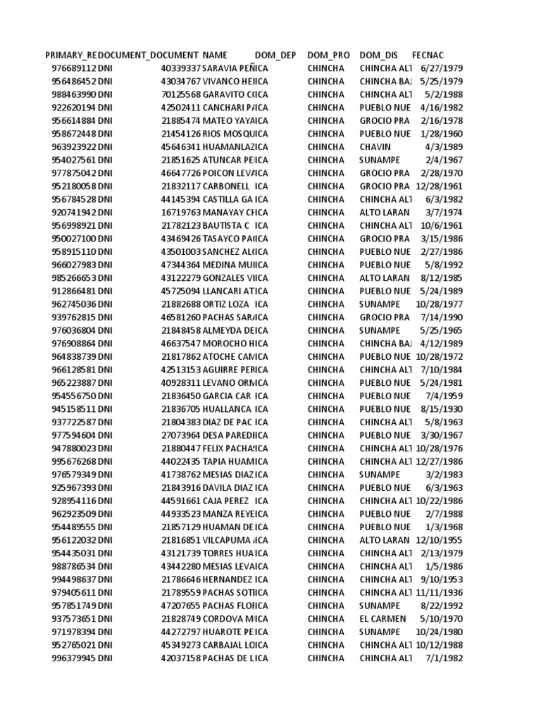 956144319 DNI 21887661 HUAYTA VILLICA CHINCHA CHINCHA ALT 6/30/1978