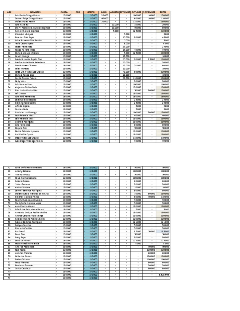 ABC NOMBRES CUOTA COD GRUPO JULIO AGOSTOSEPTIEMBRE OCTUBRE NOVIEMBRE TOTAL
