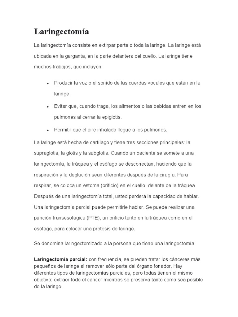La laringectomía consiste en extirpar parte o toda la laringe. La laringe está