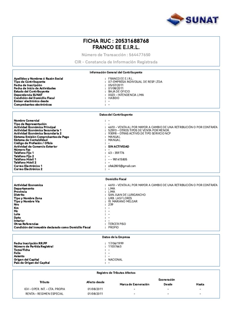 Apellidos y Nombres ó Razón Social : FRANCO EE E.I.R.L.