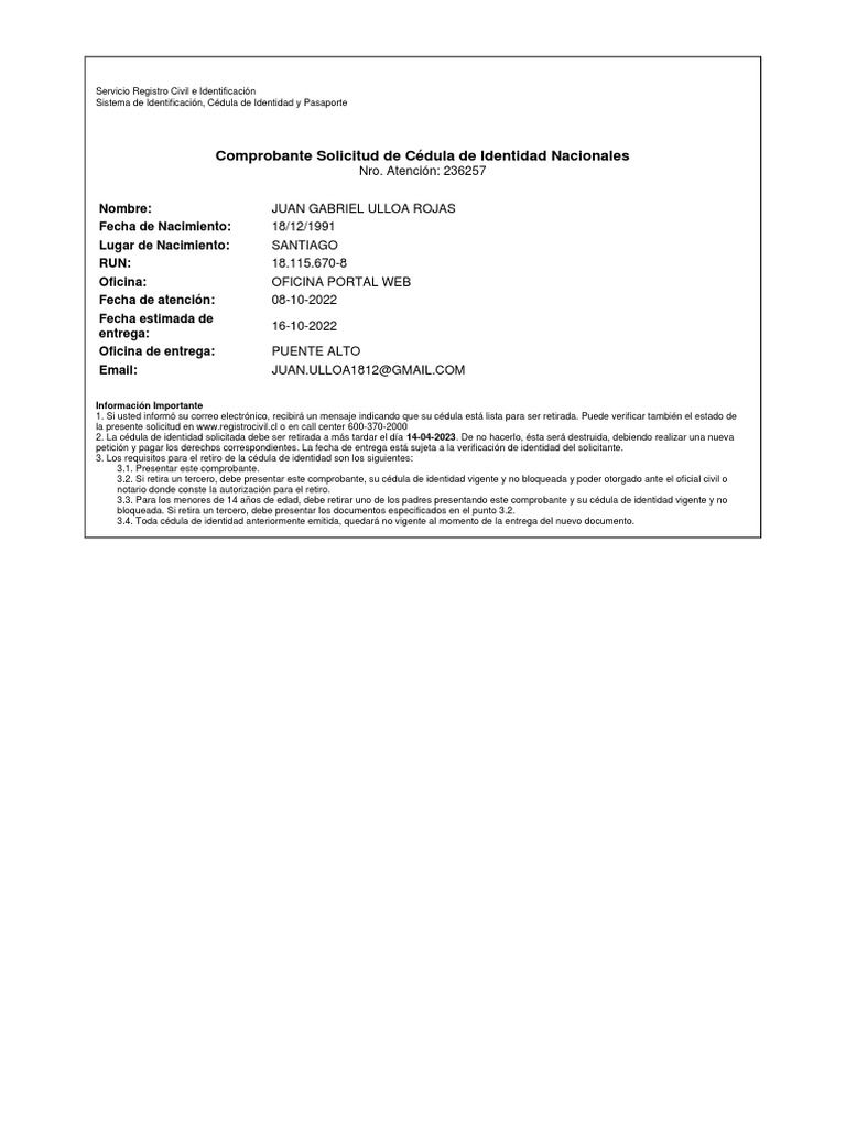 Comprobante Solicitud de Cédula de Identidad Nacionales