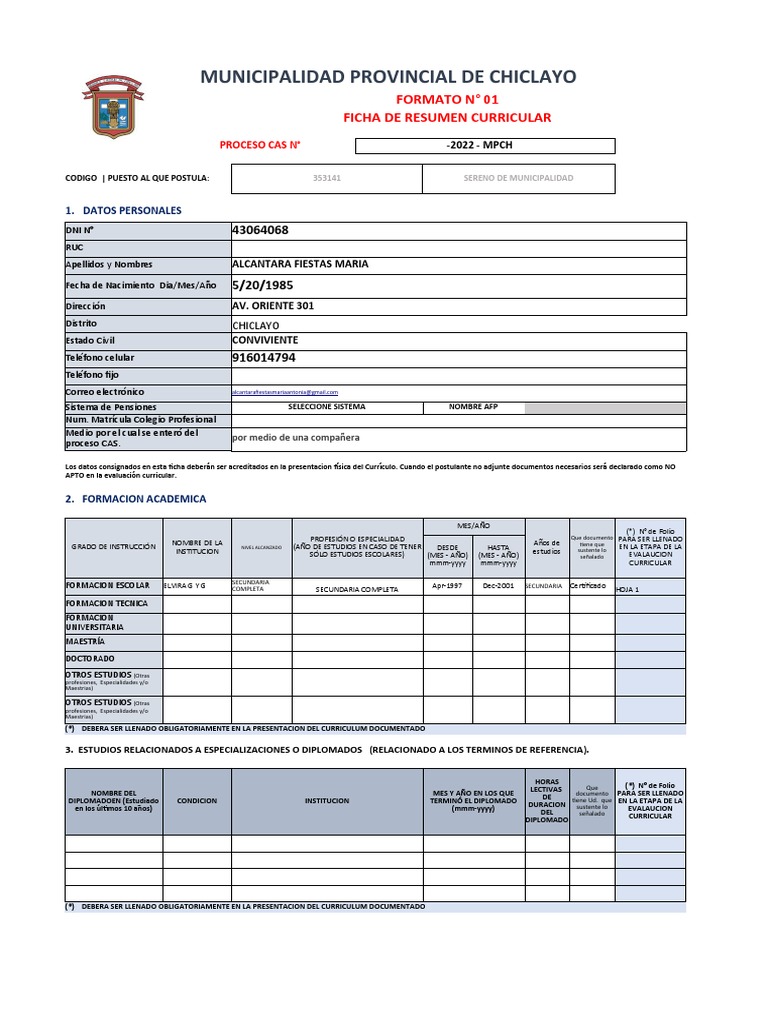 Los datos consignados en esta ficha deberán ser acreditados en la presentacion física del Currículo. Cuando el postulante no adjunte documentos necesarios será declarado como NO