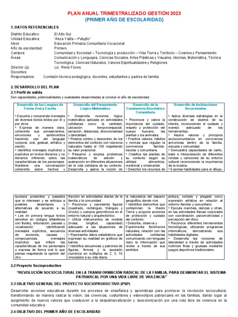MINISTERIO DE EDUCACIÓN. 2022. Plan Anual Trimestralizado. Educacion Primaria Vocacional del primer año de escolaridad.
