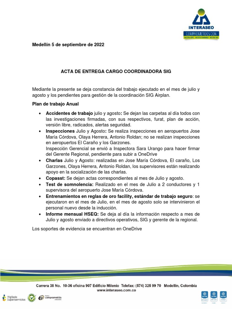 Julio y agosto enviado a directivos operativos, SIG y gerente de la regional.