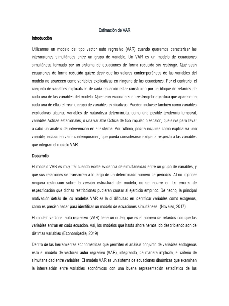 interacciones simultáneas entre un grupo de variable. Un VAR es un modelo de ecuaciones
