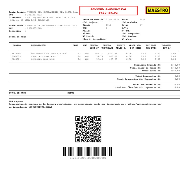 Representación impresa de la factura electrónica, el comprobante puede ser descargado en : http://www.maestro.com.pe/