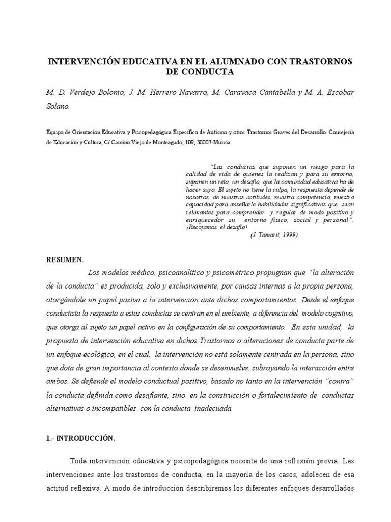 Los modelos mdico, psicoanaltico y psicomtrico propugnan que la alteracin de la conducta es producida, solo y exclusivamente, por causas internas a la propia persona, otorgndole un papel pasivo a la intervencin ante dichos comportamientos. Desde el enfoque conductista la respuesta a estas conductas se centran en el ambiente, a diferencia del modelo cognitivo, que otorga al sujeto un papel activo en la configuracin de su comportamiento. En esta unidad, la propuesta de intervencin educativa en dichos Trastornos o alteraciones de conducta parte de un enfoque ecolgico, en el cual, la intervencin no est solamente centrada en la persona, sino que dota de gran importancia al contexto donde se desenvuelve, subrayando la interaccin entre ambos. Se defiende el modelo conductual positivo, basado no tanto en la intervencin contra la conducta definida como desafiante, sino en la construccin o fortalecimiento de conductas alternativas o incompatibles con la conducta inadecuada.