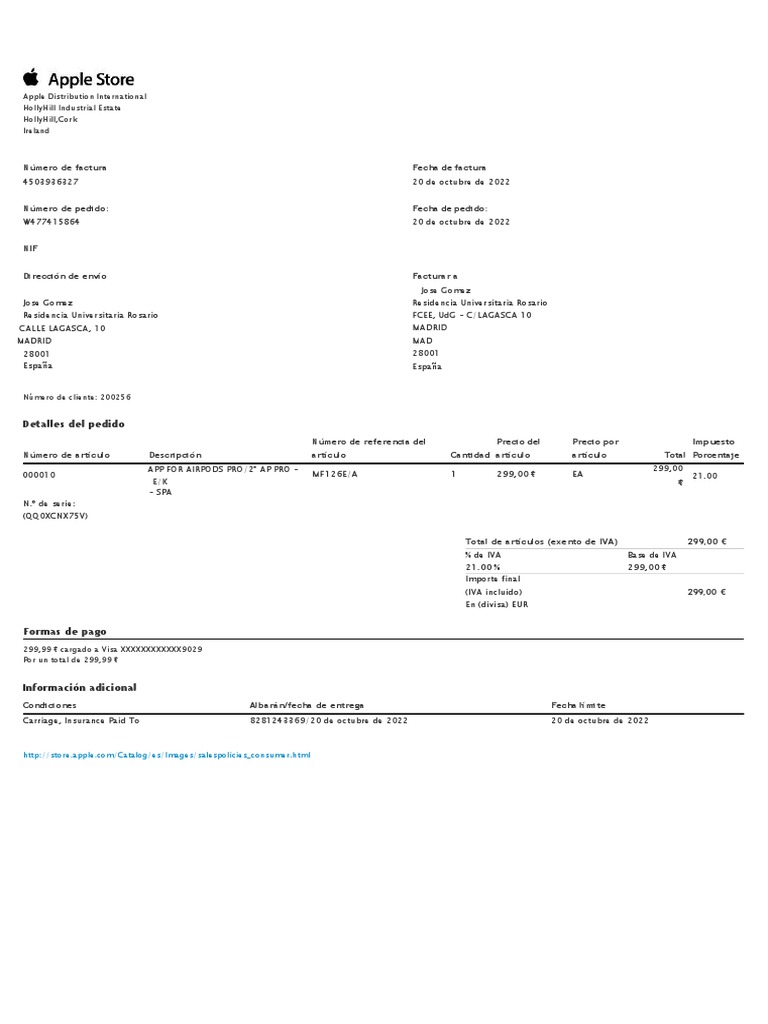 299,99 € cargado a Visa XXXXXXXXXXXX9029