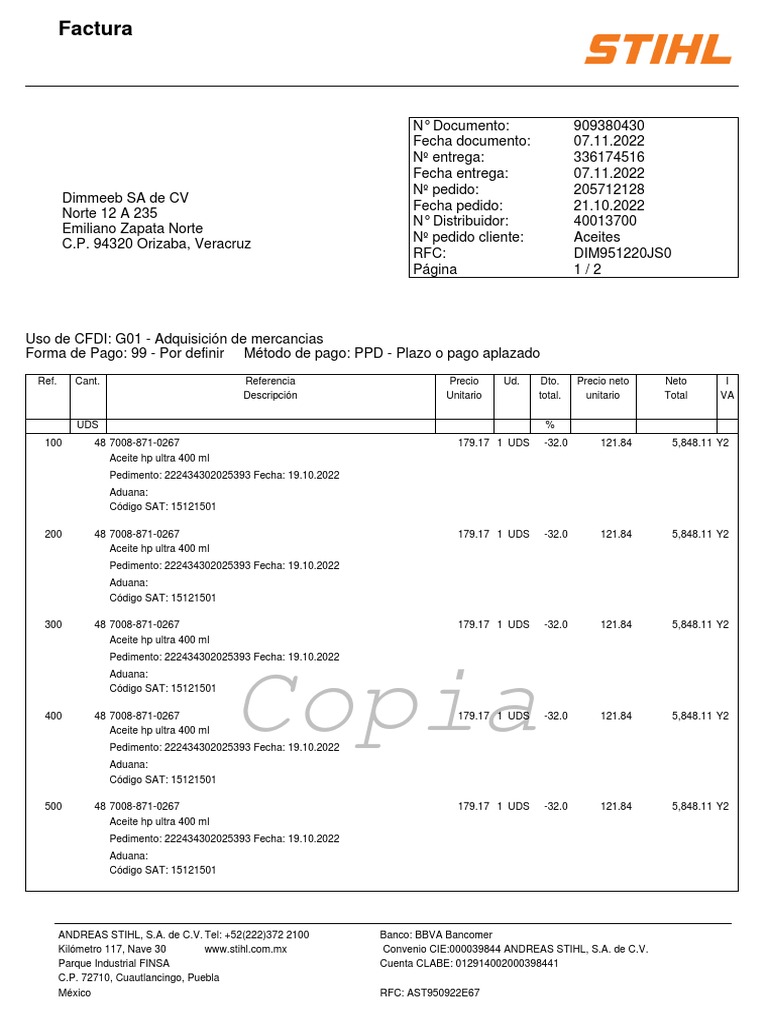 ANDREAS STIHL, S.A. de C.V. Tel: +52(222)372 2100 Banco: BBVA Bancomer