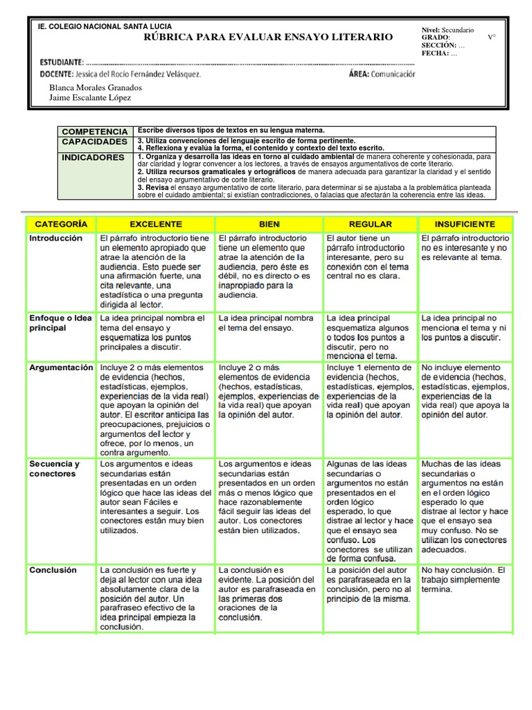 RÚBRICA PARA EVALUAR ENSAYO LITERARIO GRADO: V°