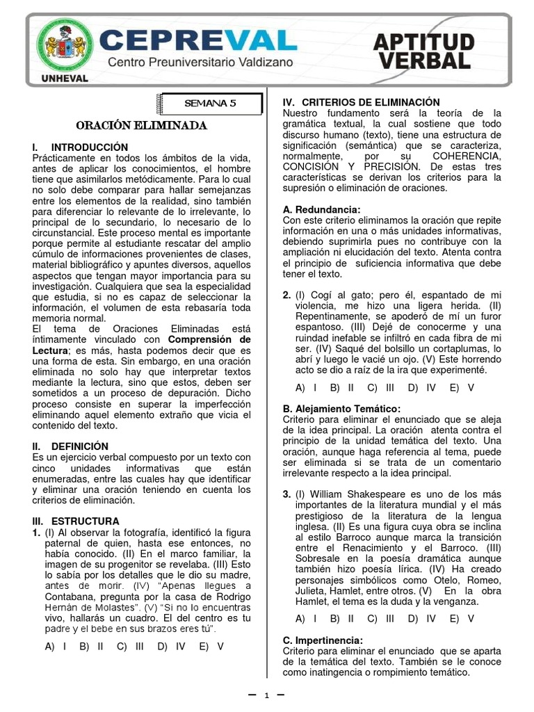 Criterio para eliminar el enunciado que contiene A) I B) II C) III D) IV E) V