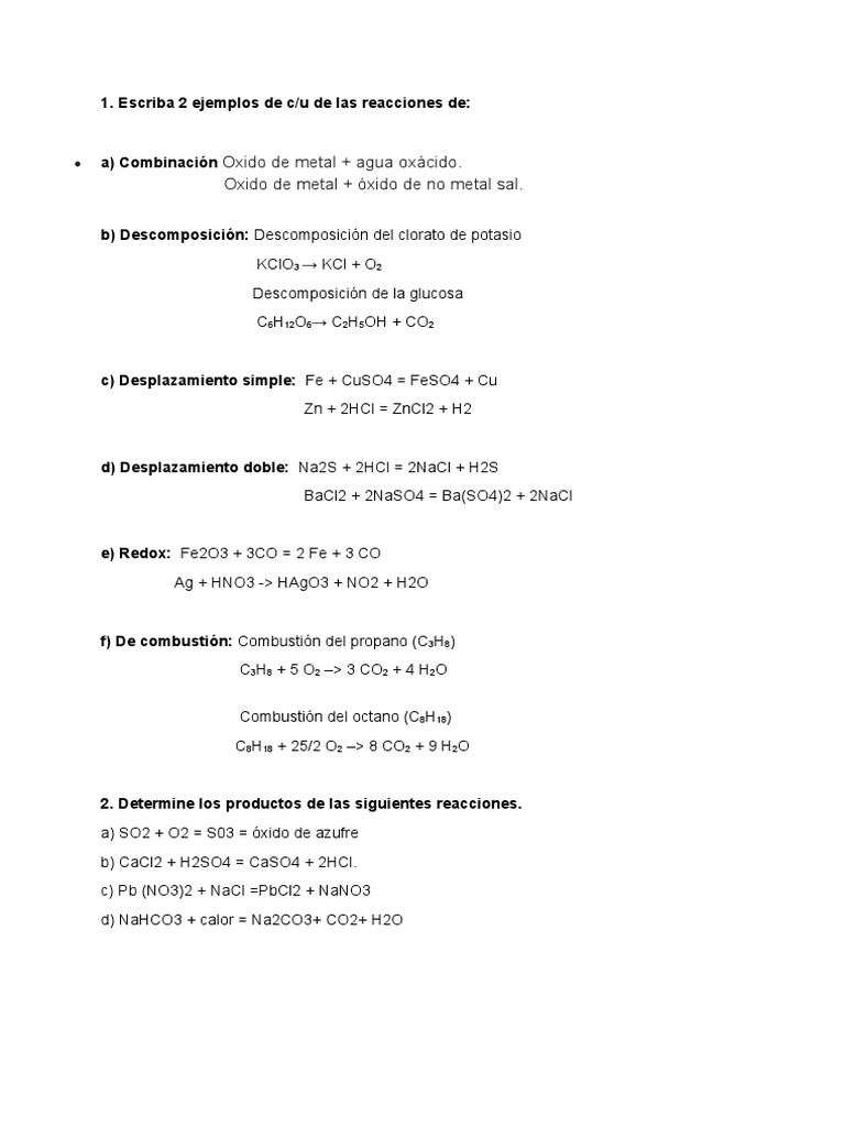 Escriba 2 ejemplos de c/u de las reacciones de: