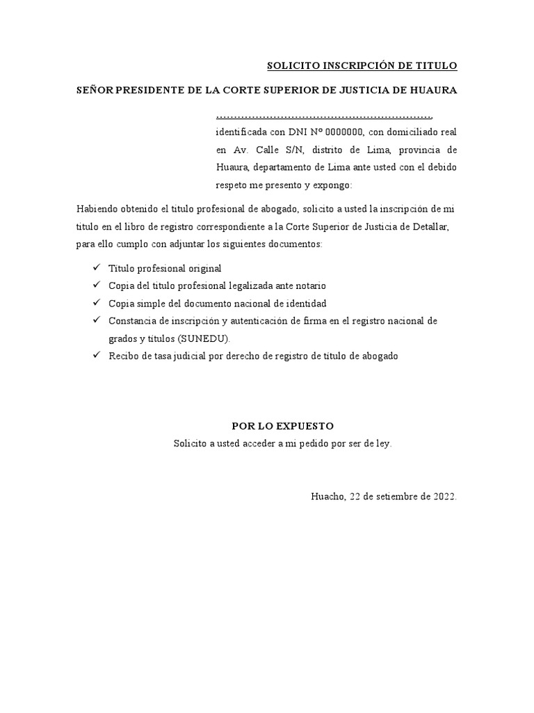 Habiendo obtenido el titulo profesional de abogado, solicito a usted la inscripción de mi