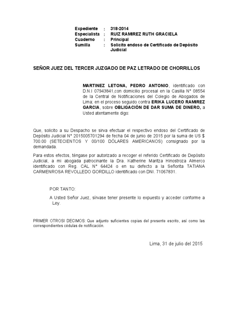 Sumilla : Solicito endoso de Certificado de Depósito