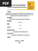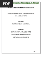 DESCRIPCION DE LA SITUACIN ACTUAL Para el inicio de las actividades de pasantas la sucursal GARZON de las Vegas de Triba tenia de haber iniciado actividades, con equipos, maquinarias, inmuebles entre otros totalmente nuevos. Por ello para la empresa se hace necesario un control del funcionamiento de los mismos, en este sentido la gerencia de mantenimiento determina que la mejor forma de llevar una planificacin, programacin, control y ejecucin las actividades que mantengan en buen estado, operatividad de los equipos e inmuebles adems de determinar el personal necesario es a travs de un plan de mantenimiento. En la actualidad las actividades de mantenimiento que se llevan a cabo son rutinarias y programadas recomendadas por el fabricante y/o distribuidor ya que los equipos y maquinarias se encuentran en garanta por tal motivo el plan que se va a desarrollar dentro de las empresa solo contempla las actividades de mantenimiento rutinarias y programadas. El historial de las fallas por avera que sucedan con el equipo permitir mejorar el plan de mantenimiento a fin de evitar fallas de los equipos y/o paradas afectando la produccin.