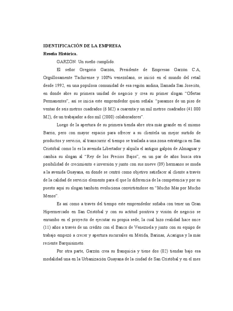 de Noviembre del 2010 abri sus puertas en las Vegas de Triba, Municipio Crdenas del Estado Tchira. Es de destacar, que luego el Slogan paso por Te da Ms, hasta llegar al que hoy tiene que es De lo bueno mucho ms! De esta manera el grupo genera empleo en cada regin donde opera la cadena Garzn y sobre todo siembra su cultura organizacional, la cual apunta en los valores de Humildad, Amor, Responsabilidad y Disciplina. Misin. Somos una empresa innovadora con proyeccin nacional, conformada por gente comprometida con el cliente, dispuesta a ofrecerle una experiencia de compra de calidad a precios bajos. Visin. Ser la Empresa que genera mayor valor agregado y liderazgo ante el consumidor con ms rapidez y solidez con polticas de mejoramiento continuo, en la capacitacin y desarrollo de nuestro Talento Humano. Superando nuestros propios logros para crecer sostenidamente y convertirnos en la cadena de Hipermercados ms grande del pas. Valores. El logro de nuestra visin requiere una actuacin superior y en continua mejora de todas las reas y niveles de la organizacin, para lo cual contamos con nuestros principales valores, los cuales se centran en: La atencin al cliente. Existimos para servir con excelente calidad al cliente, pues sabemos que esa calidad y calidez de atencin, es retribuida con fidelidad hacia nuestra marca. Cada uno de nosotros entrega al cliente amabilidad, cordialidad y complacencia, y as regalar una pequea fraccin de la regin que nos vio nacer como organizacin.
