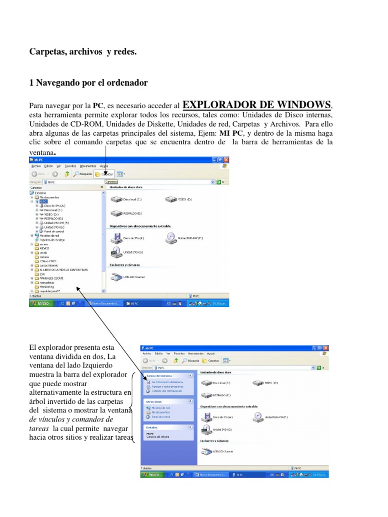 Para navegar por la PC, es necesario acceder al EXPLORADOR DE WINDOWS, esta herramienta permite explorar todos los recursos, tales como: Unidades de Disco internas, Unidades de CD-ROM, Unidades de Diskette, Unidades de red, Carpetas y Archivos. Para ello abra algunas de las carpetas principales del sistema, Ejem: MI PC, y dentro de la misma haga clic sobre el comando carpetas que se encuentra dentro de la barra de herramientas de la ventana.