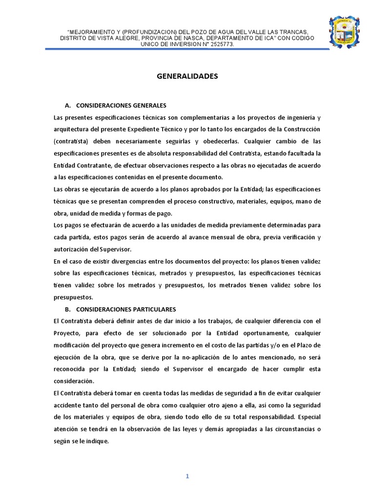 Las presentes especificaciones técnicas son complementarias a los proyectos de ingeniería y