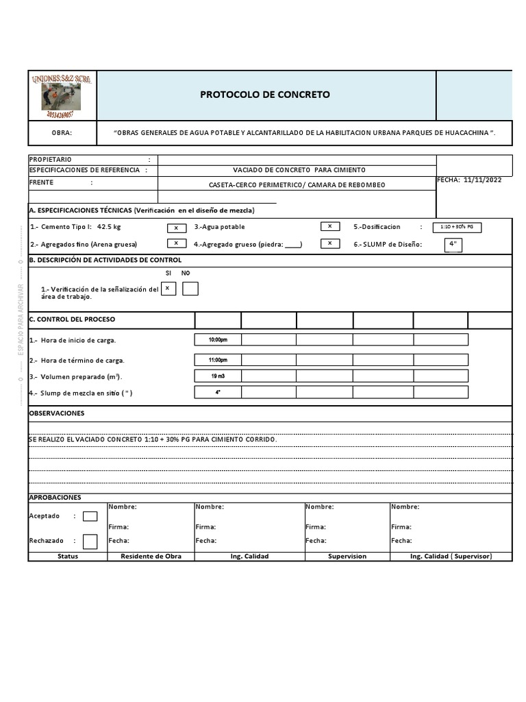 2.- Agregados fino (Arena gruesa) x 4.-Agregado grueso (piedra: ____) x 6.- SLUMP de Diseño: 4"