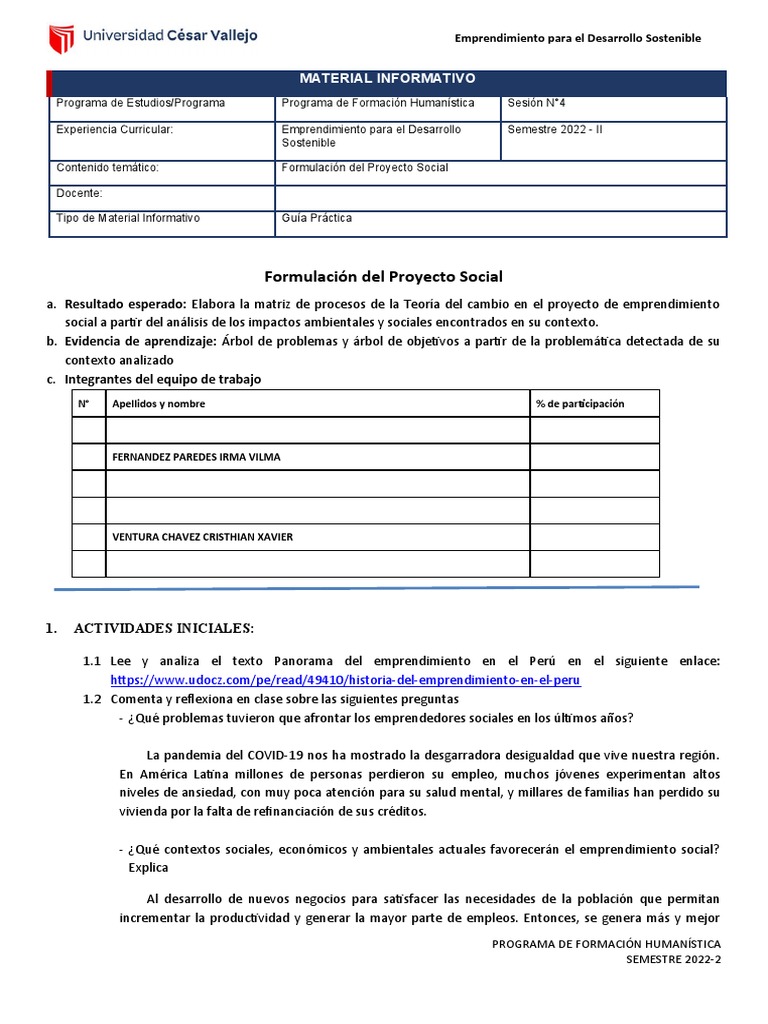 Experiencia Curricular: Emprendimiento para el Desarrollo Semestre 2022 - II