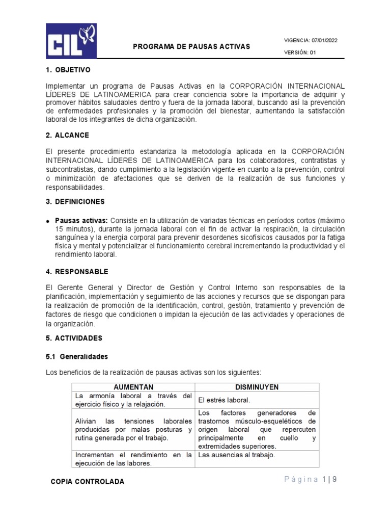 15 minutos), durante la jornada laboral con el fin de activar la respiración, la circulación