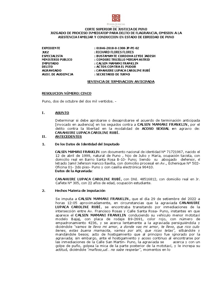 modalidad de ACOSO SEXUAL, en agravio de CARALINE RUBÍ CANAHUIRE LUPACA.