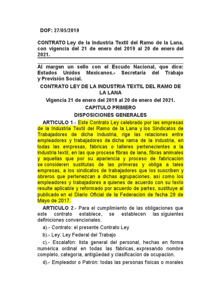 CONTRATO Ley de la Industria Textil del Ramo de la Lana,