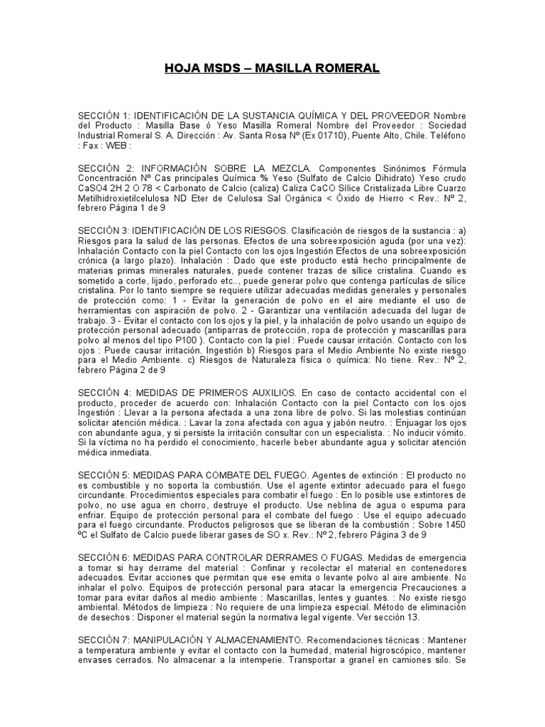 del Producto : Masilla Base ó Yeso Masilla Romeral Nombre del Proveedor : Sociedad