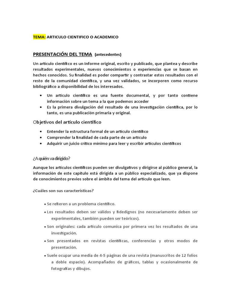 Un artículo científico es un Informe original, escrito y publicado, que plantea y describe