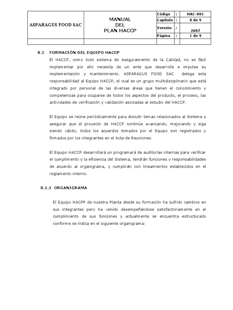 8.1 FORMACIÓN DEL EQUIPO HACCP