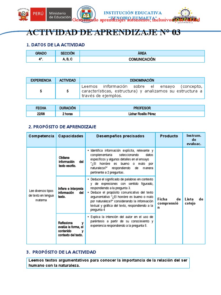 Por tal motivo, los estudiantes de la IE Zenobio Zumaeta, se plantean escribir un Actividad 11, 12, 13