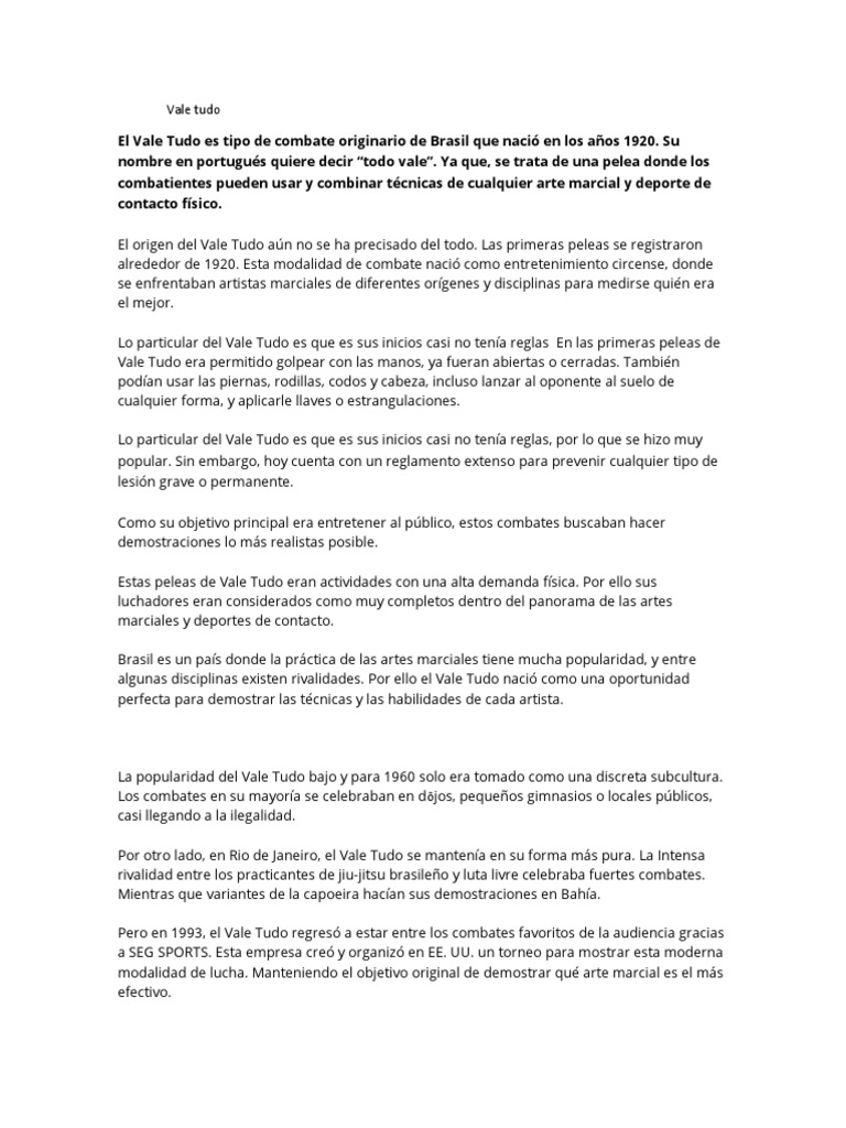 El Vale Tudo es tipo de combate originario de Brasil que nació en los años 1920. Su