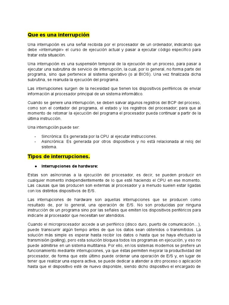 Una interrupción es una suspensión temporal de la ejecución de un proceso, para pasar a