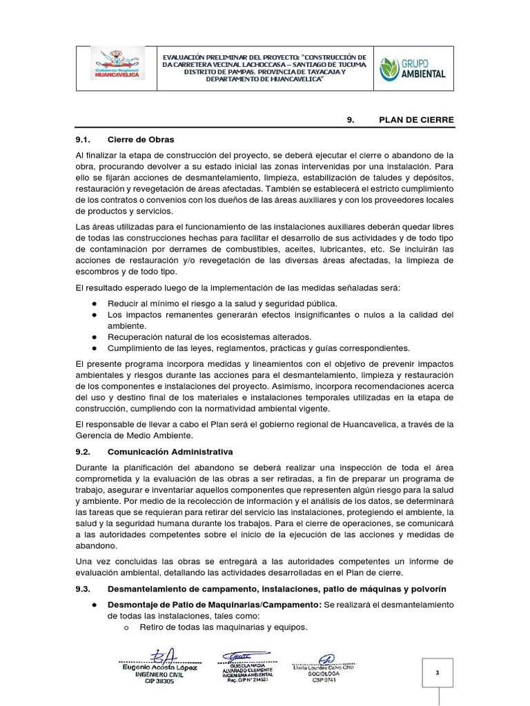 evaluación ambiental, detallando las actividades desarrolladas en el Plan de cierre.