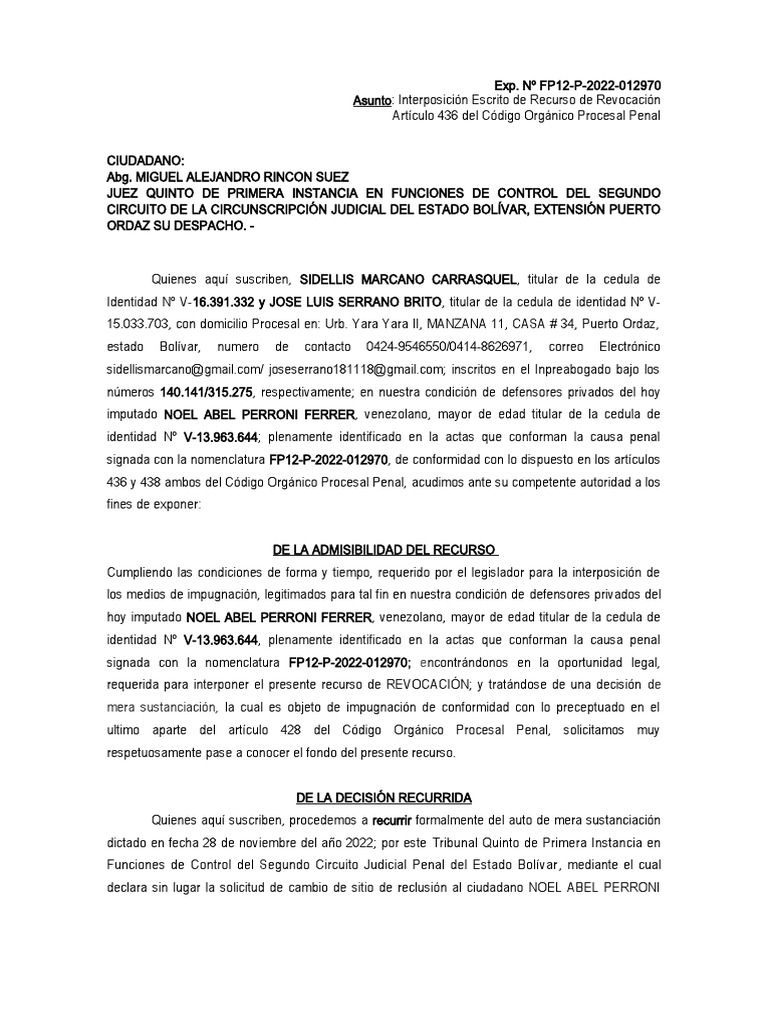 FERRER, presentado por esta defensa en fecha en fecha 04 de noviembre del 2.022 y ratificado en