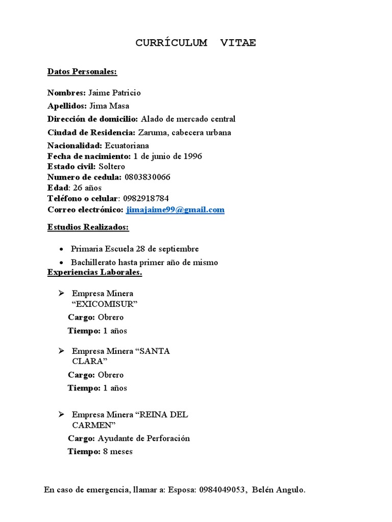En caso de emergencia, llamar a: Esposa: 0984049053, Belén Angulo.